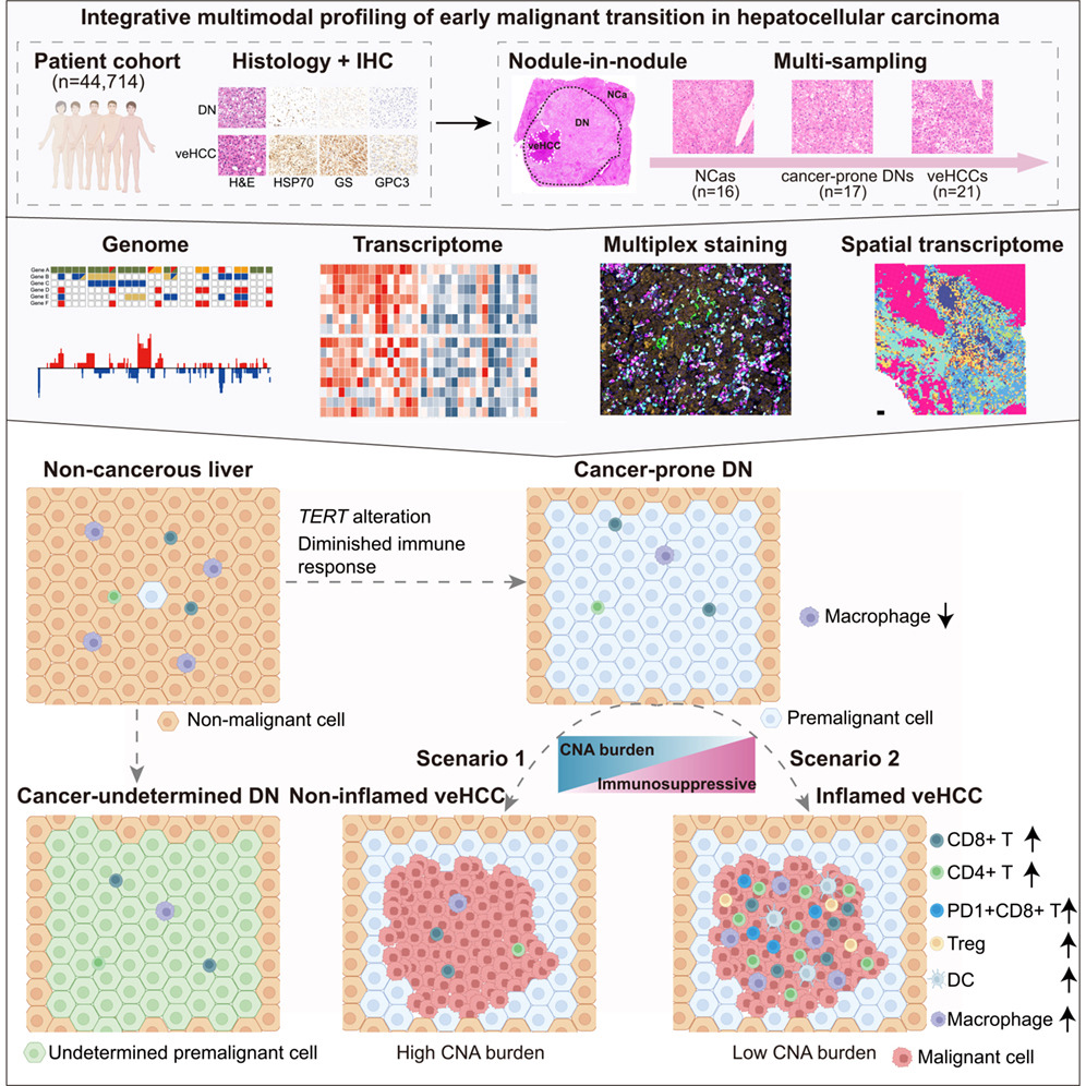 On March 26, 2026, the research team led by Hu Lijian from the Center for Excellence in Molecular Cell Science, together with Li Hong from the Shanghai Institute of Nutrition and Health, Chinese Academy of Sciences, and Professor Ji Yuan from the Department of Pathology, Zhongshan Hospital, published a study titled “Molecular insights into early malignant transition of hepatocellular carcinoma” in Cancer Cell. To address the scientific challenge of deciphering the molecular mechanisms underlying the early malignant transition of human hepatocellular carcinoma (HCC), the team collaborated with three major liver cancer centers in China over a period of nine years. From more than 44,000 FFPE human HCC surgical samples, they rigorously screened and ultimately obtained 17 precious clinical samples of “nodule-in-nodule” lesions, which served as the core sample foundation for unraveling the early malignant transition of HCC. The team conducted systematic genomic, transcriptomic, and immune landscape analyses on these paired samples of cancer-prone dysplastic nodules (cancer-prone DN) and the very early HCC (veHCC) within them, leading to a series of important discoveries: 82% of cancer-prone DNs harbor TERT gene alterations, which act as a key “pre-risk factor” rather than a direct trigger for malignant transformation; the core molecular event driving early malignant transition of HCC may not be traditionally focused single nucleotide variations (SNVs) but the continuous accumulation of copy number alterations (CNAs). The study also found that cancer-prone DNs predominantly exhibit an immune-silent “immune desert” phenotype, while 43% of veHCCs already display a unique “inflammatory phenotype with immune escape.” Based on these findings, the team proposed a “dual evolutionary pathway” for early malignant transition of HCC: CNA-driven progression and inflammatory progression with early immune escape (Figure 1), highlighting the significant potential of immunotherapy in early intervention for HCC. This work provides a novel molecular theoretical foundation for deeply understanding the mechanisms of early malignant transition in HCC and achieving early screening, early diagnosis, and precise intervention. Dr. Zhang Zhengtao from the Center for Excellence in Molecular Cell Science, Chinese Academy of Sciences, Dr. Li Hong from the Shanghai Institute of Nutrition and Health, Chinese Academy of Sciences, and Dr. Chen Lingli from the Department of Pathology, Zhongshan Hospital, are the co-first authors of this paper. Professors Hui Lijian, Li Hong, and Professor Ji Yuan from the Department of Pathology, Zhongshan Hospital, are the co-corresponding authors.