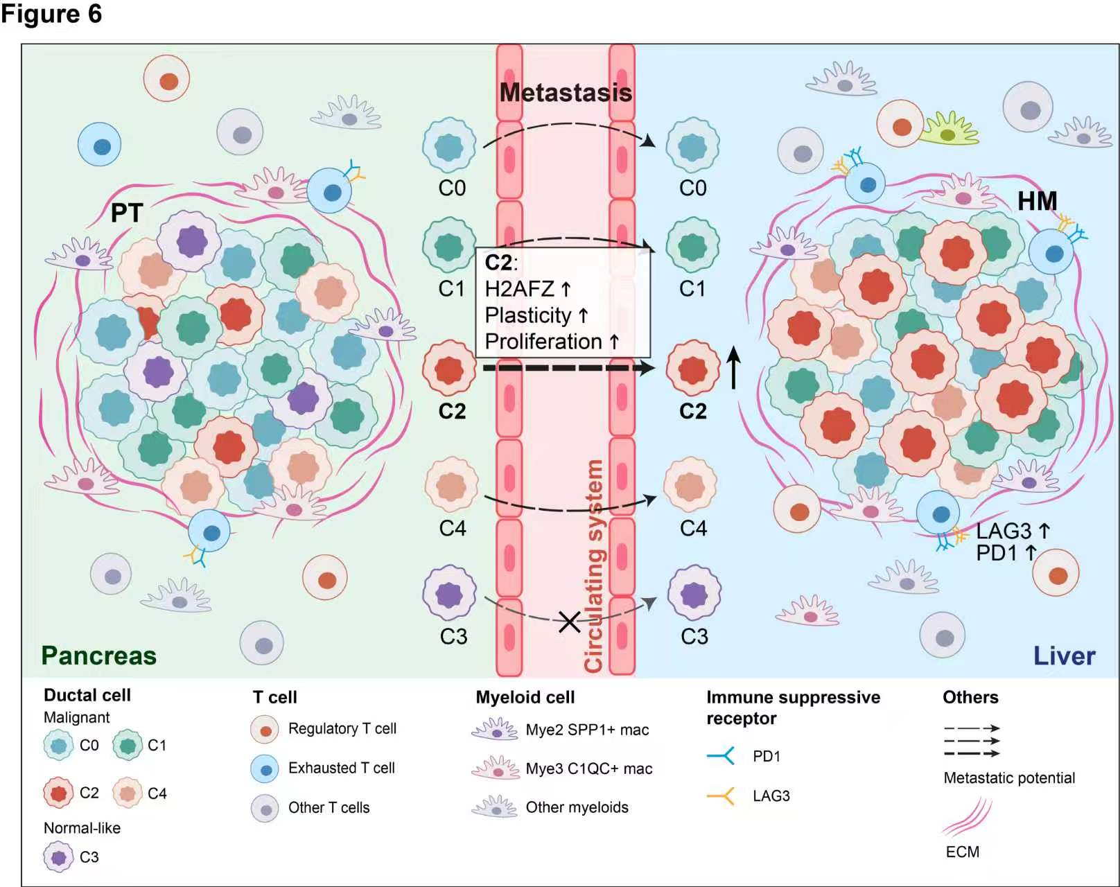 Our analysis identified a metastasis-prone malignant subpopulation, which is associated with a higher risk of hepatic metastasis and a transitional plastic state. This malignant subpopulation represents a poorly differentiated and highly proliferative phenotype, with H2AFZ potentially contributing to this phenomenon. Moreover, the presence of tumor cells in the liver was accompanied by an increased abundance of M2 macrophages, regulatory T cells, and exhausted T cells in HMs compared with adjacent tissues, indicative of a shift toward an immune suppressive environment. Notably, within the tumor environment of HMs, exhausted T cells exhibited elevated expression of PDCD1 and LAG3. The combined therapy targeting these two genes effectively inhibited tumor growth in mouse models of metastatic PDAC.