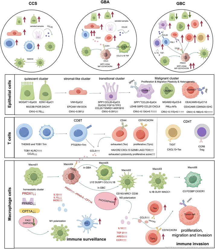 We first conducted single-cell RNA sequencing and downstream bioinformatics analyses on samples from nine patients with CCS, GBA, and GBC. Key molecular findings were subsequently validated using publicly available bulk RNA-seq datasets (n = 80) and multiplex immunohistochemistry in an independent cohort (n = 62). Functional validation of tumor microenvironment-associated molecules was performed through a series of in vitro and in vivo assays.