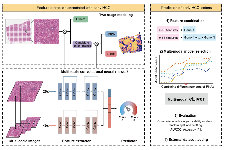 On April 2, 2026, the research team led by Li Hong from the Shanghai Institute of Nutrition and Health, Chinese Academy of Sciences, in collaboration with the team of Professor Ji Yuan from the Department of Pathology, Zhongshan Hospital, published a study titled “Multimodal AI model for early detection of hepatocellular carcinoma” in npj Precision Oncology. The study developed a novel two-stage, multi-scale deep learning model named TMC-net, which can accurately capture the subtle features of both the macro-architectural tissue organization and micro-cellular morphology of HGDN and eHCC in pathological images. The model also possesses good interpretability, allowing it to identify key features consistent with clinically recognized pathological diagnostic criteria. By further integrating transcriptomic comparative analysis, the team identified four core gene biomarkers and combined the AI-extracted pathological image features with the expression levels of these key genes to build a multimodal auxiliary diagnostic model, effectively improving the diagnostic performance for eHCC. Additionally, the model generates a visualized risk heatmap that can intuitively highlight critical lesion areas, effectively assisting junior pathologists in improving diagnostic accuracy and consistency. Overall, this study establishes an integrated pathway for combining pathological and molecular omics data, providing a novel technological solution for addressing the challenging pathological diagnosis of early-stage liver cancer. Dr. Jing Siyu, a postdoctoral fellow at the Shanghai Institute of Nutrition and Health, Chinese Academy of Sciences, Li Xueliang, a doctoral student, and Wen Hong, a master’s graduate from Zhongshan Hospital (now a pathologist at the Department of Pathology, Fujian Cancer Hospital), are the co-first authors of this paper. Professor Li Hong and Professor Ji Yuan are the co-corresponding authors.